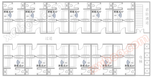 寮のアクセス環境が密集し、壁の遮断が多く、無線信号の減衰が比較的に大きく、パネル式APは各部屋に1台ずつ配置することを推奨している。次の図に示します。